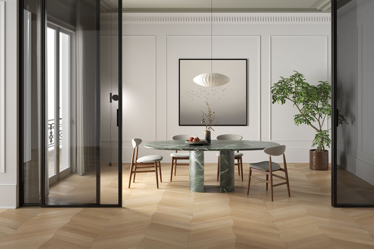 The refined Chevron composition creates harmonious geometries with a classic touch that can evoke the prestige of historic noble villas.